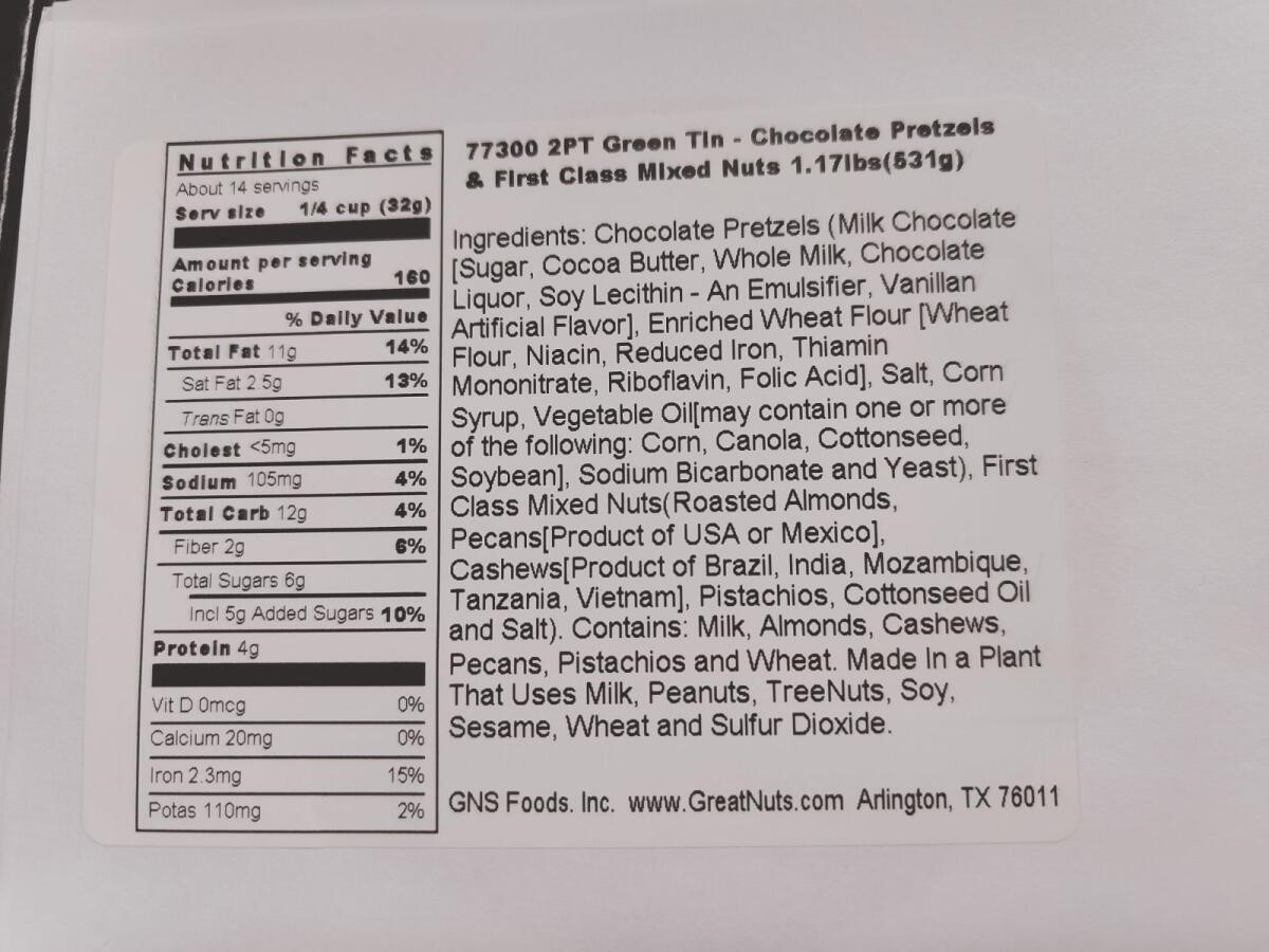 Enjoy our best selling First Class Nut Mix with roasted cashews, almonds, pecans and pistachio nut meats. Combine that with our velvety chocolate covered pretzels, and you have a gift that goes anywhere, anytime. It all comes in an elegant green banker tin. And, sometimes, gifts are meant to be enjoyed at home! Net Wt: 1.17 lb.